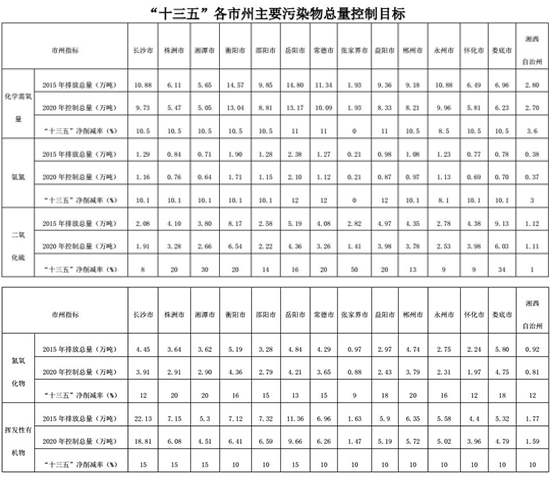 (二)主要目標。到2020年,全省萬元生產(chǎn)總值能耗比2015年下降16%,能源消費總量控制在17849萬噸標準煤以內(nèi)。全省化學需氧量、氨氮、二氧化硫、氮氧化物、揮發(fā)性有機物排放總量分別控制在108.57萬噸、13.58萬噸、47.05萬噸、42.24萬噸、88.45萬噸以內(nèi),比2015年分別減少10.1%、10.1%、21%、15%、10%以上。常德市、益陽市、岳陽市總磷排放量均下降10%以上。