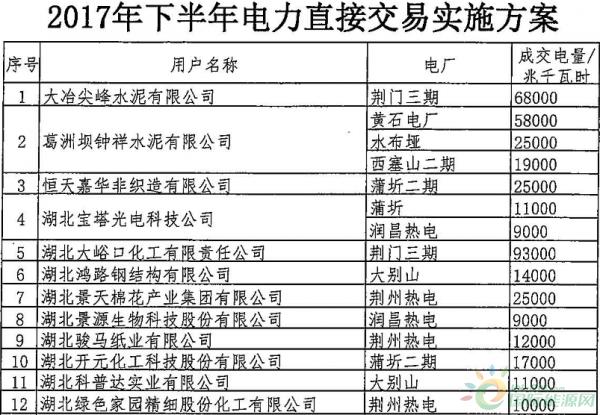 按照《省發(fā)展和改革委員會關(guān)于組織開展2017年度電力直接交易工作的通知》(鄂發(fā)改能源[2016]788號)和《湖北省2017年電力直接交易公告(2017年第4號)》有關(guān)規(guī)定,國電荊門發(fā)電有限公司等18家發(fā)電企業(yè)與武漢鋼鐵股份公司等56家用戶經(jīng)雙邊自由協(xié)商或掛牌交易,達(dá)成了2017年下半年電力直接交易發(fā)、用成交意向。經(jīng)省電力直接交易聯(lián)合工作小組研究確認(rèn),現(xiàn)印發(fā)2017年下半年電力直接交易實施方案。請省電力公司盡快組織簽定發(fā)、供、用三方購售電合同。