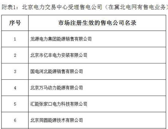 冀北電力交易中心有限公司于2017年10月19日至2017年11月19日共對13家售電公司進行了公示,具體為:北京電力交易中心受理并在冀北電網(wǎng)有售電業(yè)務的龍源電力集團能源銷售有限公司等9家售電公司;北京電力交易中心推送業(yè)務范圍變更至冀北的北京經(jīng)開智控能源管理股份有限公司等4家售電公司。