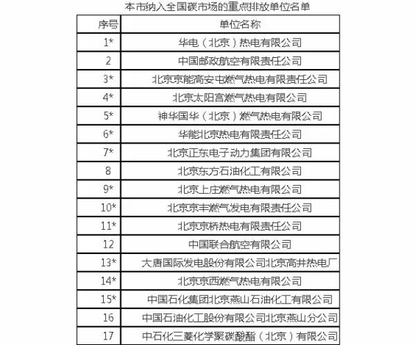 北京市納入全國碳市場的重點(diǎn)排放單位名單