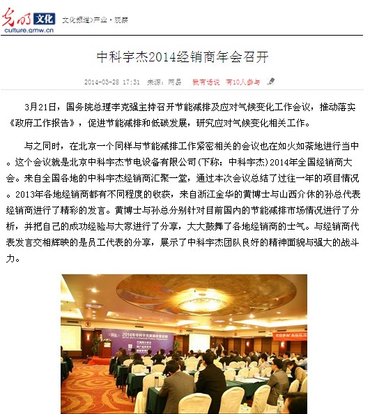 與之同時,在北京一個同樣與節(jié)能減排工作緊密相關(guān)的會議也在如火如荼地進(jìn)行當(dāng)中。這個會議就是北京中科宇杰節(jié)電設(shè)備有限公司(下稱:中科宇 杰)2014年全國經(jīng)銷商大會。來自全國各地的中科宇杰經(jīng)銷商匯聚一堂,通過本次會議總結(jié)了過往一年的項目情況。2013年各地經(jīng)銷商都有不同程度的收 獲,來自浙江金華的黃博士與山西介休的孫總代表經(jīng)銷商進(jìn)行了精彩的發(fā)言。黃博士與孫總分別針對目前國內(nèi)的節(jié)能減排市場情況進(jìn)行了分析,并把自己的成功經(jīng)驗 與大家進(jìn)行了分享,大大鼓舞了各地經(jīng)銷商的士氣。與經(jīng)銷商代表發(fā)言交相輝映的是員工代表的分享,展示了中科宇杰團(tuán)隊良好的精神面貌與強(qiáng)大的戰(zhàn)斗力。
