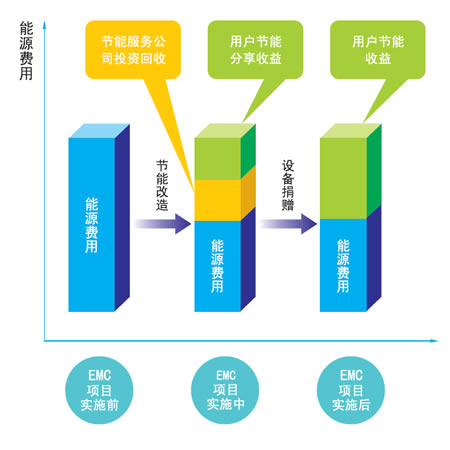 EMC 為客戶(hù)提供能源系統(tǒng)診斷、節(jié)能項(xiàng)目可行性分析、節(jié)能項(xiàng)目設(shè)計(jì),幫助項(xiàng)目融資,選擇并采購(gòu)設(shè)備、安裝調(diào)試、進(jìn)行項(xiàng)目管理、培訓(xùn)操作人員、合同期內(nèi)系統(tǒng)設(shè)備維 護(hù)、節(jié)能量監(jiān)測(cè)等一條龍服務(wù),然后與客戶(hù)共同驗(yàn)證項(xiàng)目的節(jié)能效果、環(huán)境效益與經(jīng)濟(jì)效益,最后,與客戶(hù)分享項(xiàng)目實(shí)施后取得的經(jīng)濟(jì)效益,回收項(xiàng)目的投資和獲得 應(yīng)有的利潤(rùn)。