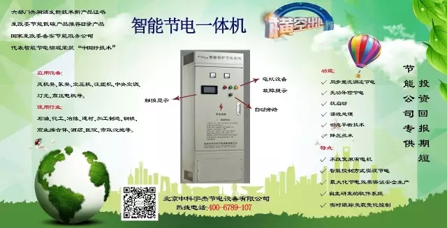 中科宇杰“智能節(jié)電一體機”橫空出世,為工業(yè)企業(yè)帶來福音,產(chǎn)品廣泛適用于工業(yè)、商業(yè)樓宇、院校、銀行、油田、船舶等眾多領(lǐng)域。更有八大節(jié)電系統(tǒng),滿足您的任何能耗設(shè)備需求,節(jié)電效果顯著,節(jié)電率高達(dá)15%—65%。